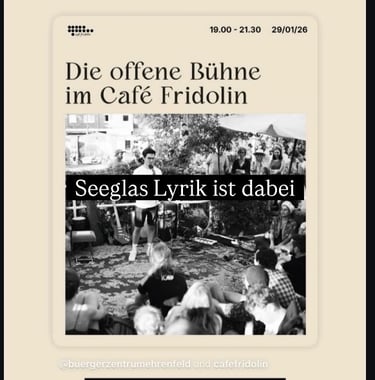 Ich freue mich, euch einladen zu dürfen zur offenen Bühne im Café Fridolin. Es wird ein bunt gemischter Abend mit unterschiedlichsten Gästen und Texten. Und darunter fand sich auch Raum für stille, naturverbundene Lyrik mit Haltung.